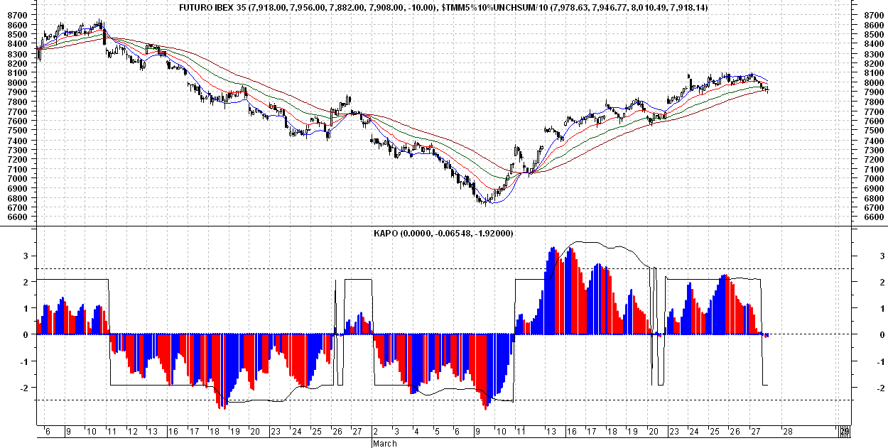 También voy a subir un gráfico en el que se puede ver el indicador. Es un gráfico de 60 minutos del Futuro del Ibex 35, que poor cierto empieza a ponerse bajista segun este indicador.