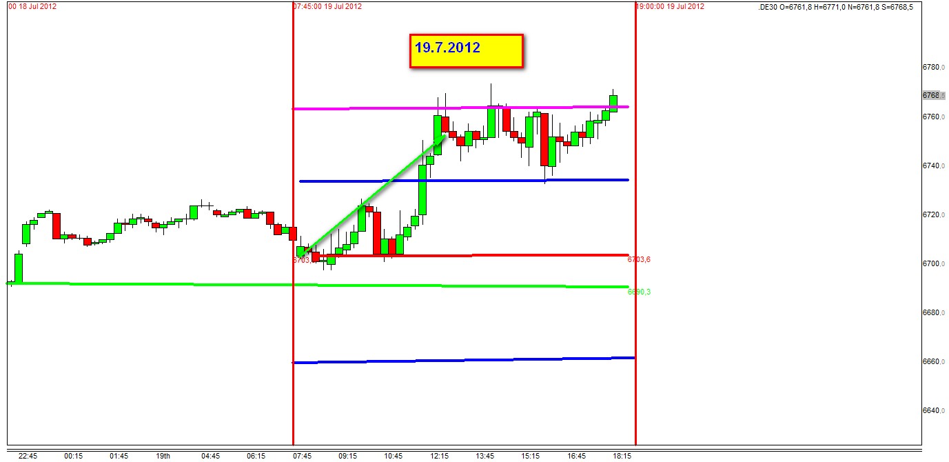 Buenas Georg hoy cogí el tramo primero largo con 43 pips y 10 contratos, el segundo tramo largo cogí un poquito 8 pips con 3 contratos, ahora busco intentar dejar una posición corta a ver si puedo aplicar la estrategia de posiciones contínuas (y si son cortas pues mejor) la tengo ahora con 25 contratos (de 1 €/pips cada uno) en 6768,3 en de30 de Flat trader o se que mañana si esto aguanta a operera con el DE30U2 (el CDF fut dax ), a ver si hay suerte y aguanta esto hasta el cierre de los fut.