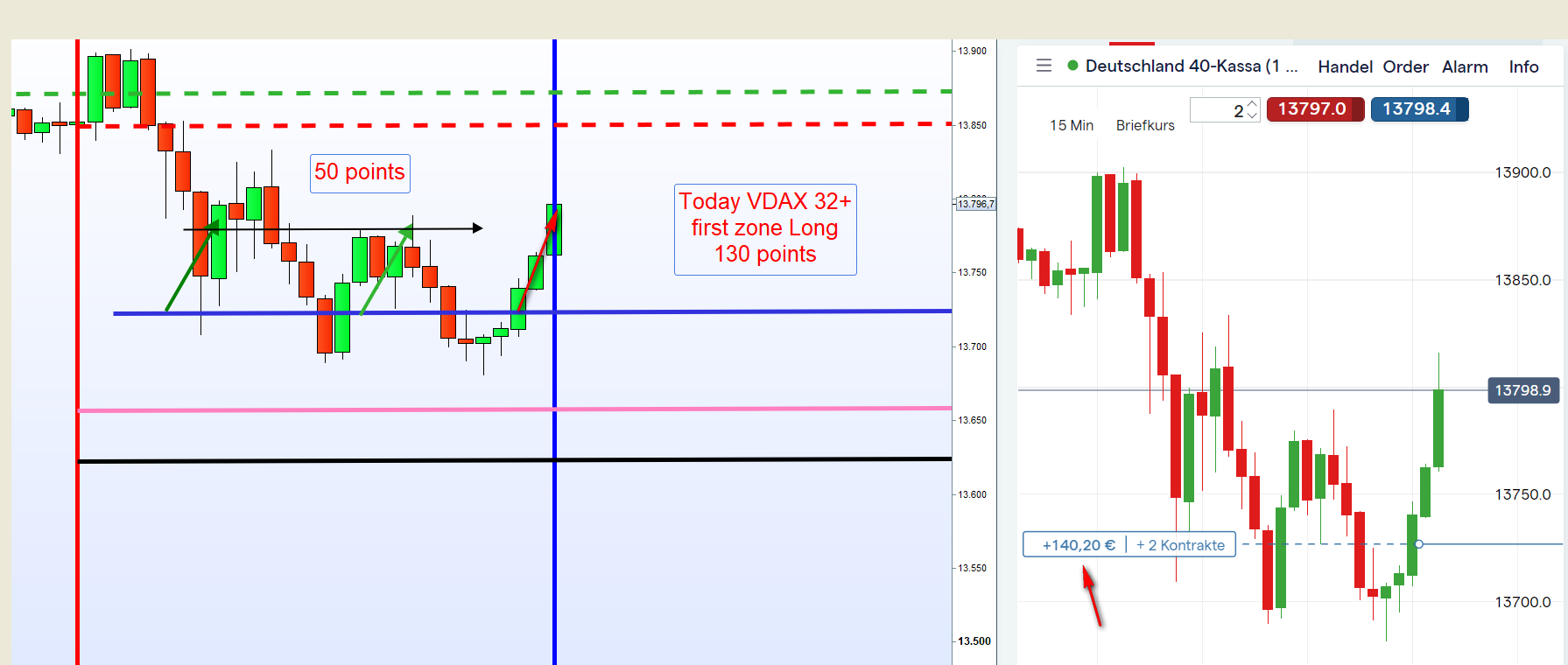 Si el VDAX-NEW cotiza por encima de 30 y los dos gaps, doble gap y wide gap, no se negocian como tales las zonas se dividen por debajo y por encima del precio de apertura. Por lo tanto, no se tiene en cuenta el precio de cierre. La entrada inicial tiene lugar después de las 9:00 horas.