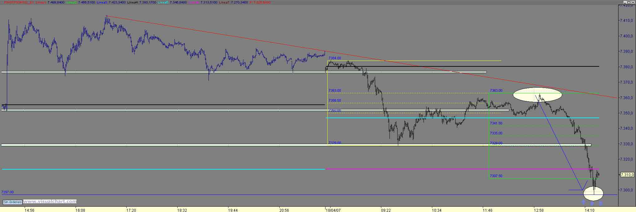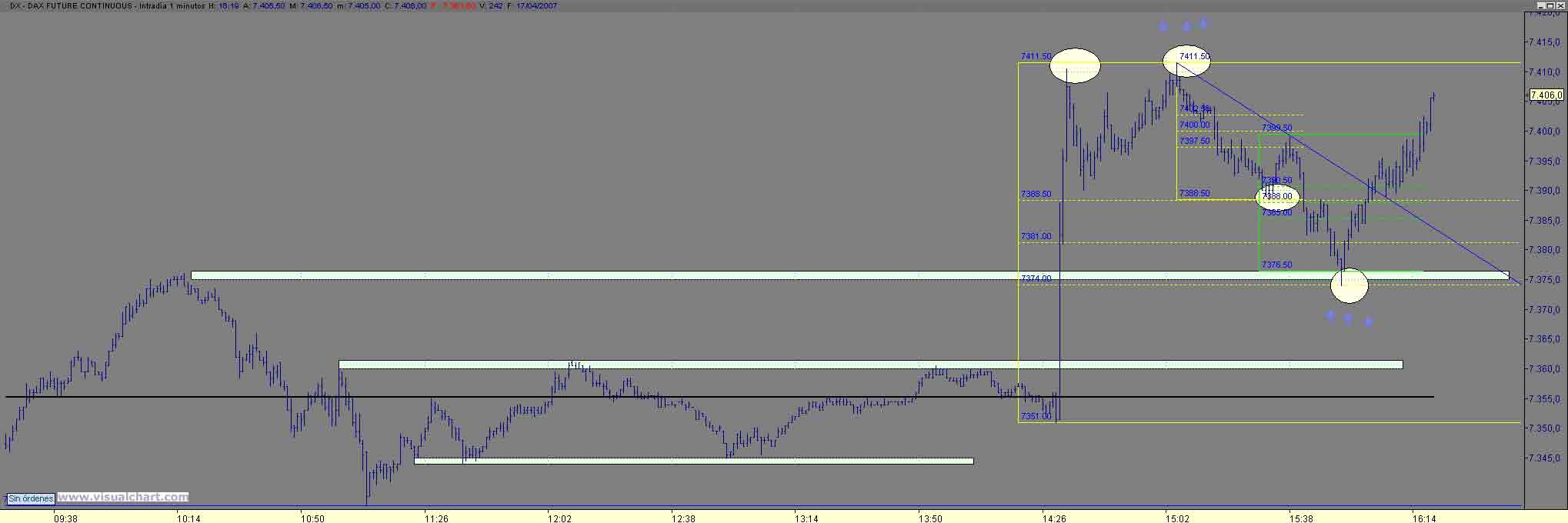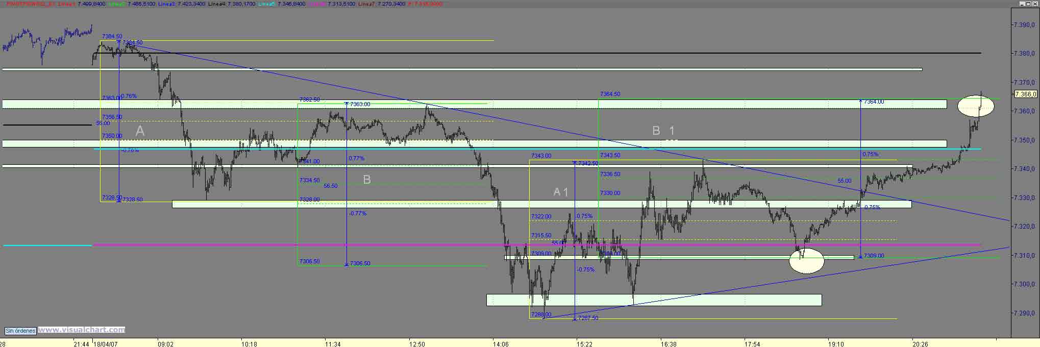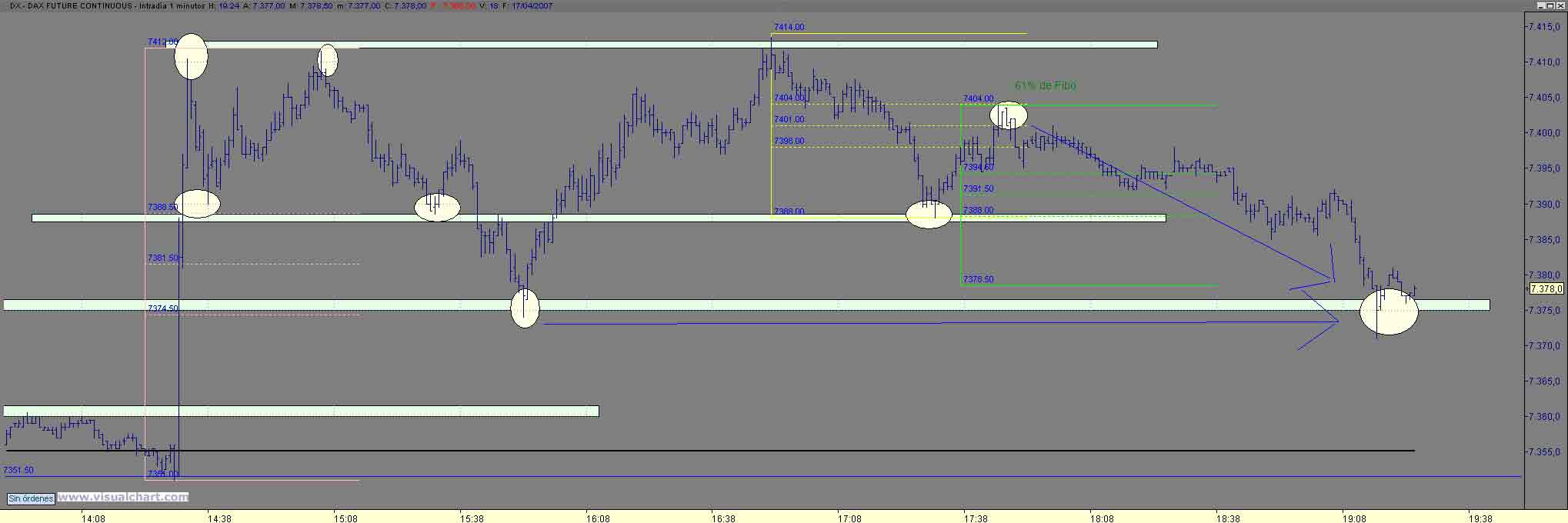 B tardes , pues tras el arreon noticiero ( mi stop salto 8 ptos mas arriba) solo nos quedaba buscar cortos alla donde diera un posibilidad con stop cercano y esa violacion de 1p de los maximos y vuelta ivitaba a ello y nos lo hizo en en dos estructuras hasta el 7374 (os suena??) mucha coincidencia como para no tomar largos (era el maximo matinal asi como el 61% de Fibo desde el arreon noticiero hasta el 7411.50) objetivo natutal de no perder el 74 el 88 90 y posteriromente 402 405 , bueno pues ahi esta Un Saludo