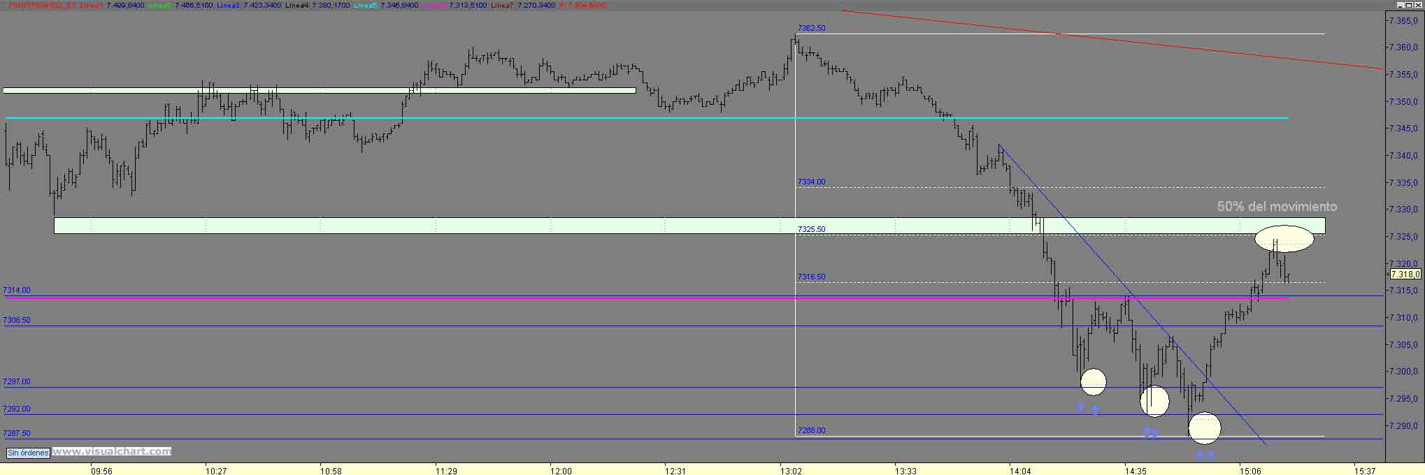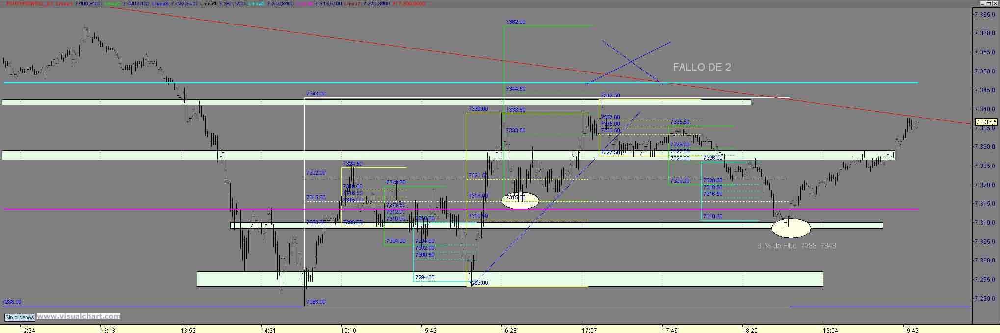 Bueno pues de nuevo estamos mirando hacia arriba y parece que los niveles de control se respetan esa vuelta desde el 60 a su 61% de Fibo (7248) que a su vez es el nivel S1 de pivot en el boble apoyo nos dio posibilidad de ir a buscar nuevamente el 7361 63 (61% de Fibo de la caida desde 7384) y quizas la bajista desde maximos en los niveles de 7367 Un Saludo