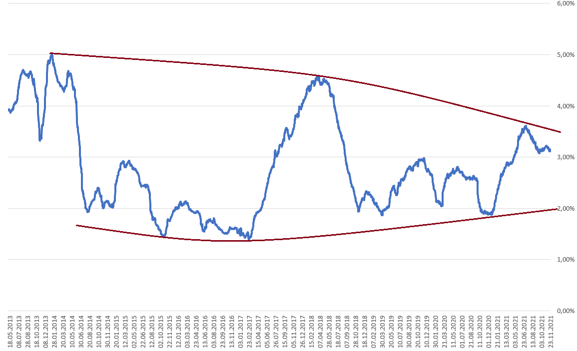 Se podría pensar que a cambio de esa bajada en la rentabilidad en el BTC se podría haber compensado con una menor volatilidad al estar en volúmenes mucho mayores que al inicio y lo cierto es que los picos de volatilidad de esta última subida han sido inferiores, aunque la volatilidad media de los últimos años se ha mantenido por encima de la que se tuvo en la corrección de 2015-2016. Se podría decir que la volatilidad busca estabilizarse entre valores máximos y mínimos anteriores, pero aun no se aprecia que baje en general. Es curioso ver que se comporta de forma asimétrica a las bolsas en el sentido de que en las correcciones alcanza sus niveles más bajos de volatilidad, mientras que en las subidas aumenta lo cual se explica por su oferta limitada. En cambio el SP500 ha mostrado un carácter más errático con una volatilidad mayor en las últimos meses por la Covid. Se ha utilizado una media de 200 sobre la volatilidad diaria para la medición, adjunto imagen: