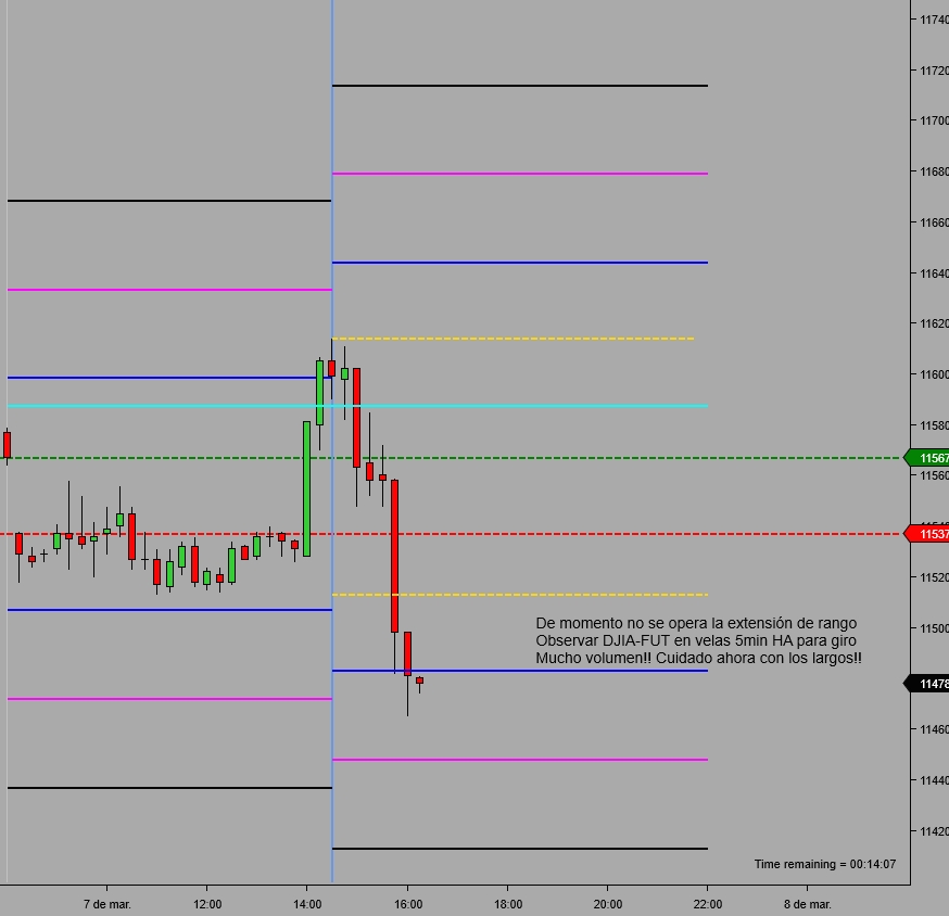 Además tampoco veo ni una sola de retroceso alcista tanto en el FDAX como en DJIA-FUT ni en velas temporales ni HA. Para mi no tiene sentido en el día de hoy meterse en la 1º zona, pero la experiencia la tiene George. Puedo equivocarme.