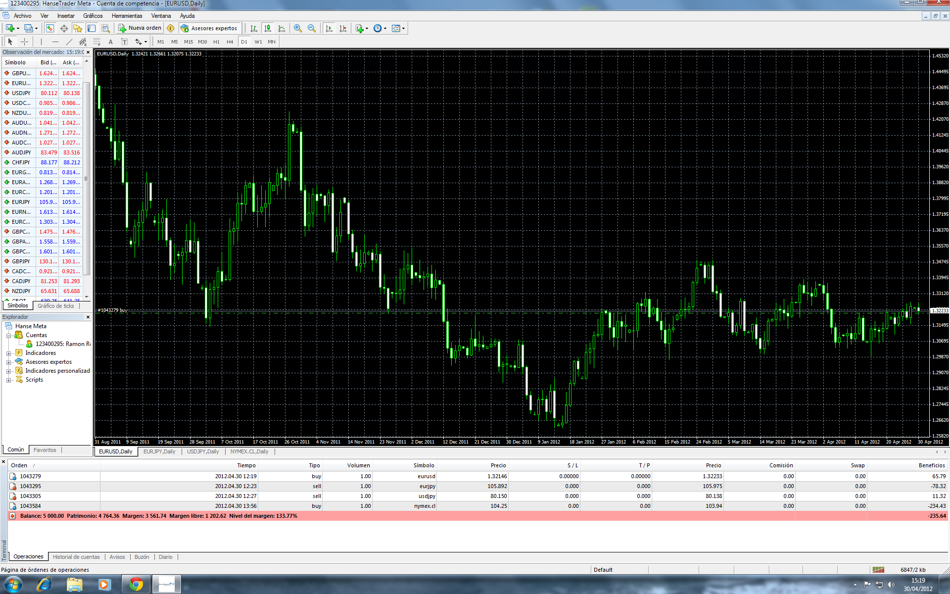 Lo que no se es como se comportan lo mercados mañana, puesto que es 1 de mayo, y no se si en usa, tambien es fiesta como aqui... bueno... 625 euros en un dia, tampoco es tan poco, solo me han dado 5000 para empezar, y no tenia ni pajolera idea de lo que se podia hacer...