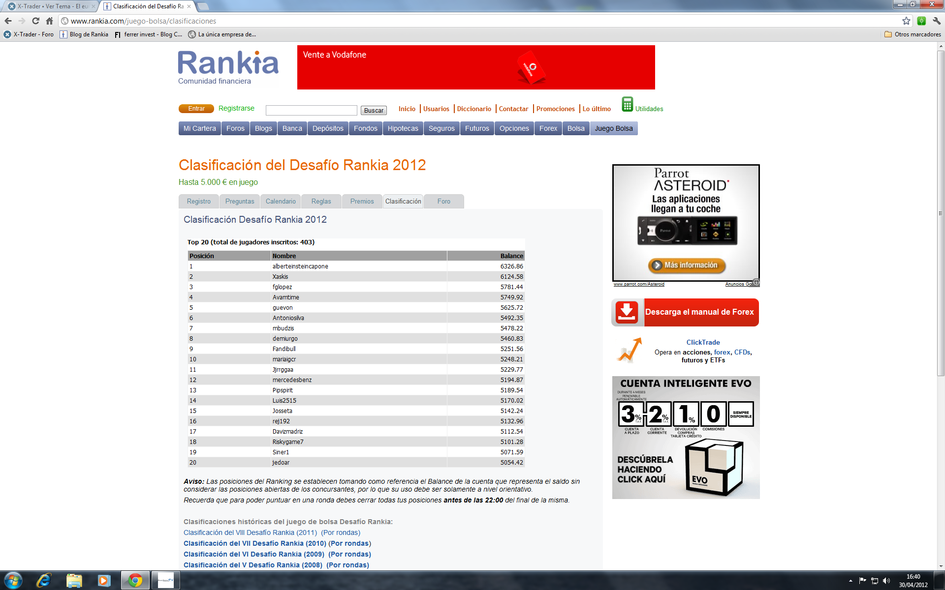 Ya te he visto en el puesto 19, jejeje... vas en el peloton jejeje... , por lo menos es en el peloton positivo jejeje... esto ya sabes como es... hoy estoy el 5 y mañana o igual en media hora me entra una "pajara" y me quedo el 168... yo las he pasado de todas las maneras...