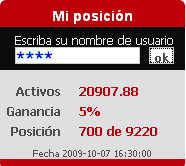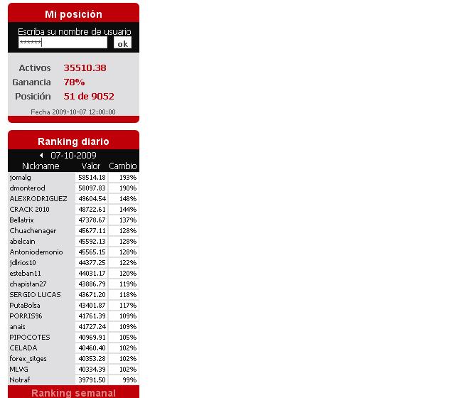 Te llevas sorpresas cuando ves en que opera la gente, prácticmente le dan a todo, cada uno especializado en una cosa. Hubo un ganador semanal en el 1º concurso, el que no tení porshe, que le pegaba duro al CORN, SYBEAN y todos esos CFD's que replican a los activos del CBOT y sacaba unas rentabilidades impresionantes.