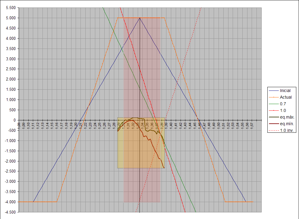 Destacar también que donde cruzan las rectas 0.7 (margen actual), 1.0 y 1.0 inv. es donde se encuentra ahora el par equity-precio. Como se puede observar está en máximos de la équity para ese precio, eso es muy bueno, significa que el sistema está funcionando correctamente. Si ese cruce se adentra hacia la zona de la équity mínima es cuando debemos empezar a preocuparnos, algo estaría funcionando mal y habría que corregirlo.