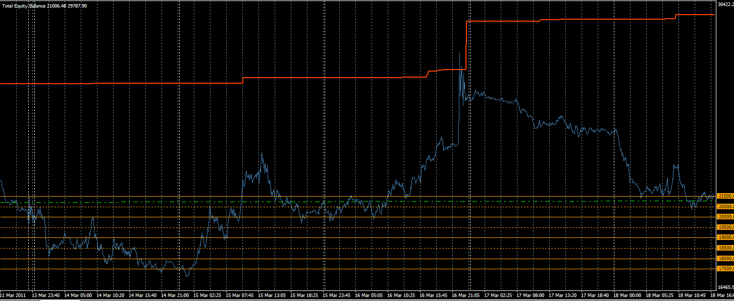 ¿Cuando perdería esta estrategia combinada? La respuesta es complicada, pero evidéntemente algún riesgo tiene que tener, pero es muy difícil de definir concretamente ya que depende mucho de lo que ocurra en momentos de "alta tensión" de uno de los sistemas. Por ejemplo ahora mismo, en esta prueba, no es ni parecido que el precio se gire en 1,41 a que se gire en 1,40. En cambio, por debajo de 1,40 daba prácticamente igual donde se girase estas últimas 3 semanas. En una situación similar nos encontramos la primera semana de Febrero. Son momentos de "alta tensión" en los que si te ves obligado a desapalancar y en esos momentos se gira el precio definitivamente acabas generando un DD muy complicado de recuperar en un plazo corto de tiempo siguiendo las normas tal y como están definidas.