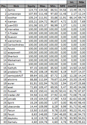 Hay 2 participantes a los que no he podido monitorizar: marvelas y Maikelnait. Segúramente los datos que han publicado en el hilo sobre usuario y password investor tienen algún error. Como no tengo datos, los he puesto con el capital inicial. El resto de participantes los tengo todos monitorizados sin problema.