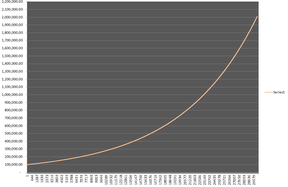 Síntesis escribió: b) al tener un mayor numero de trades se aplica el interes compuesto que aumenta el capital muy rapidamente, de forma exponencial.