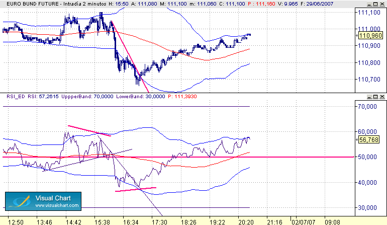 Ahora pondre unos graficos siguiendo la dinamica que comento en el sistema, donde se ven las señales, el porque de estas, los objetivos etc... en una estrategia sobre el bono a diferentes escalas de tiempo desde la grafica diaria hasta el movimiento de esta tarde del dato.
