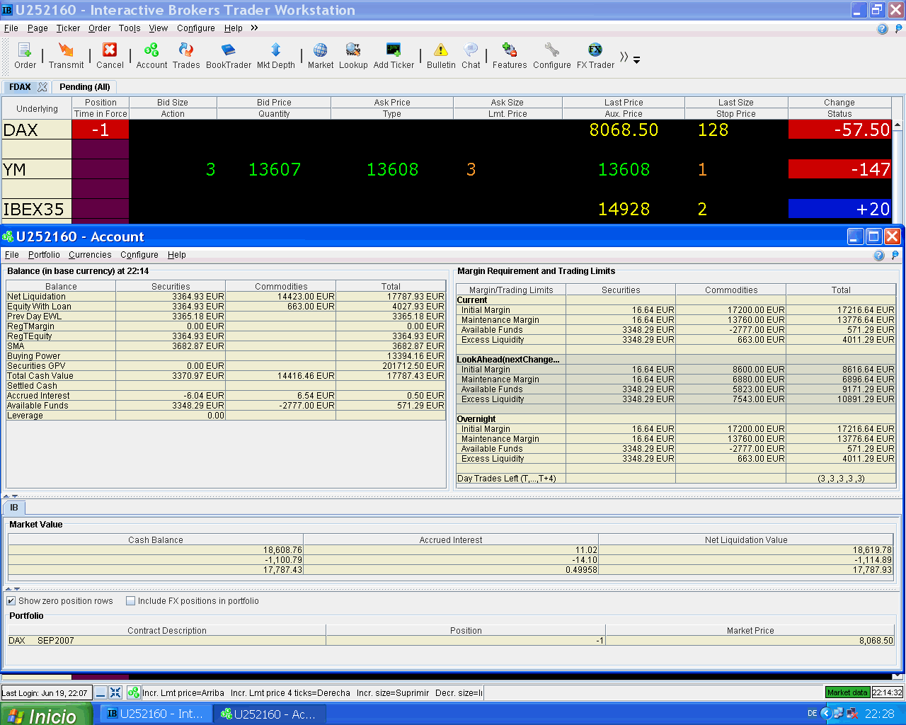 En esa cuenta con esa plataforma no perdí dinero, tampoco cuándo empezaron a ir a por mí, pero los resultados ya no eran los mismos y por eso decidí abrir cuentas en otros brokers pensando que allí cambiaría la cosa. Y efectivamente la cosa cambió, fue a peor, en todas las cuentas fueron a por mí y cómo las plataformas no tenían comparación con la X-Trader me he visto obligado a cambiar totalmente mi operativa, menos operaciones de más recorrido intentando averiguar la tendencia del día, mi error fue que seguía operando con la misma cantidad de contratos, entre 6 y 12, ERAN MUCHOS, tenía que haber operado con muchos menos, digamos 3 ó 4, y no me hubiera pasado lo que pasó.