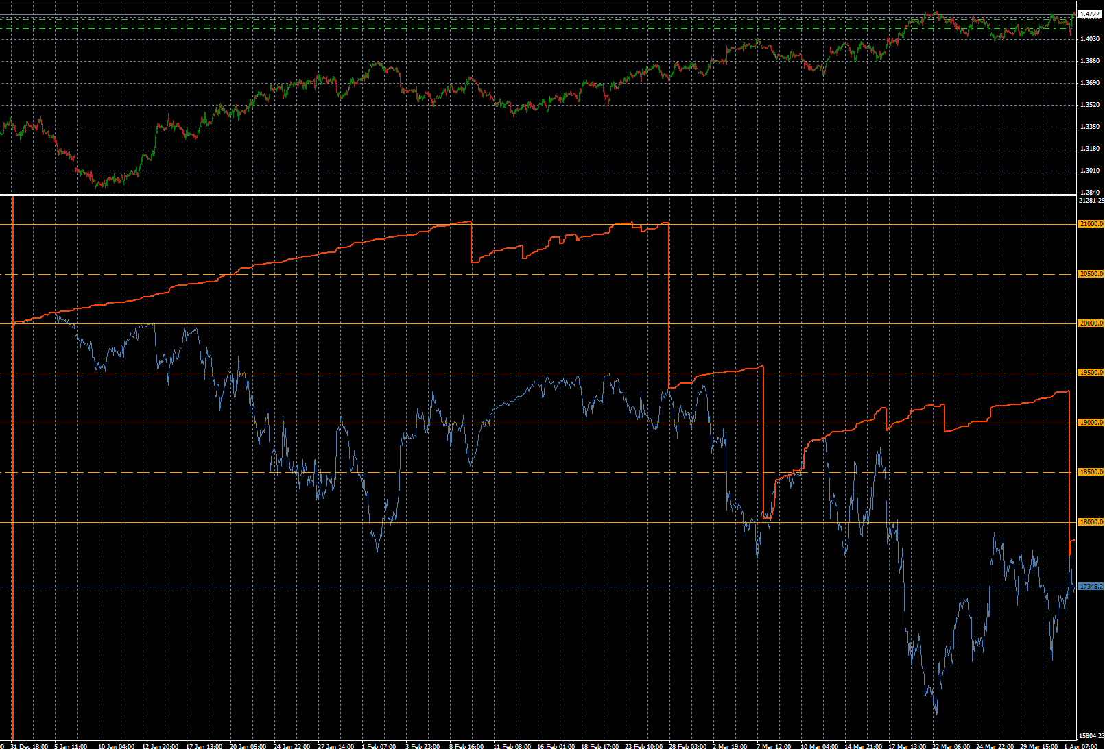 Todo tu grafico hubiera estado superbien, si hubieras jugado al hedging, e hubieras gestionado a la vez las ganancias y las perdidas, y la curva de la equity se te hubiera ido a positivo, pero asi?, es inutil... no hay nada que hacer, (bueno, si el euro baja, igual recuperas algo, pero ni asi).