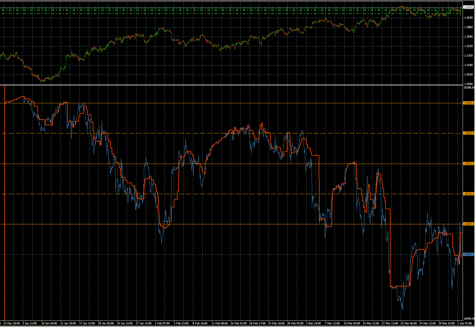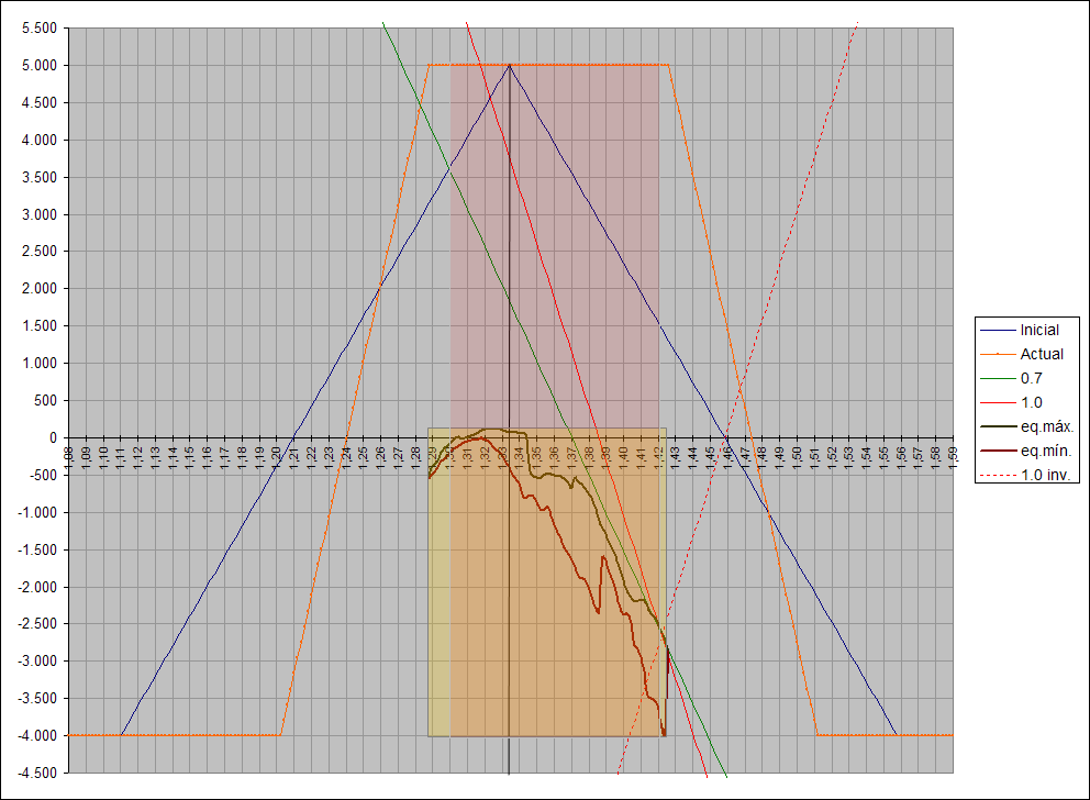 Se aprecia también como se van definiendo las zonas que deben dar lugar al rango anual que esperamos que recorra el precio. También se puede apreciar que si seguimos manteniendo el apalancamiento medio actual, durante un hipotético retroceso, recuperariamos el DD en la zona de 1,37 (unos 850 pipos por encima de los mínimos anuales)