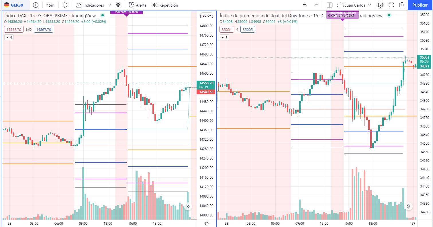 Llama la atención la volatilidad del DOW, donde en menor número de ocasiones, el precio cruza el rango definido en la mañana en su totalidad y en las dos direcciones de arriba a abajo y luego a la inversa.Imagen