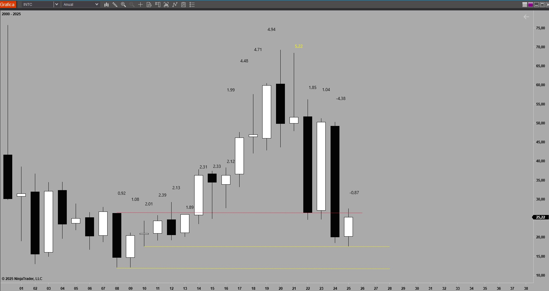 En INTC vemos que es difícil predecir el comportamiento de ciertos activos que están sujetos a una gran volatilidad. Su gráfico es una fábrica de huecos.