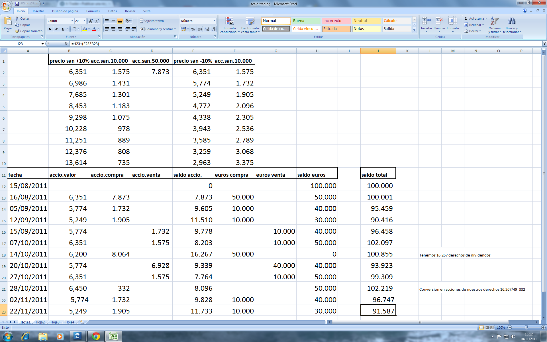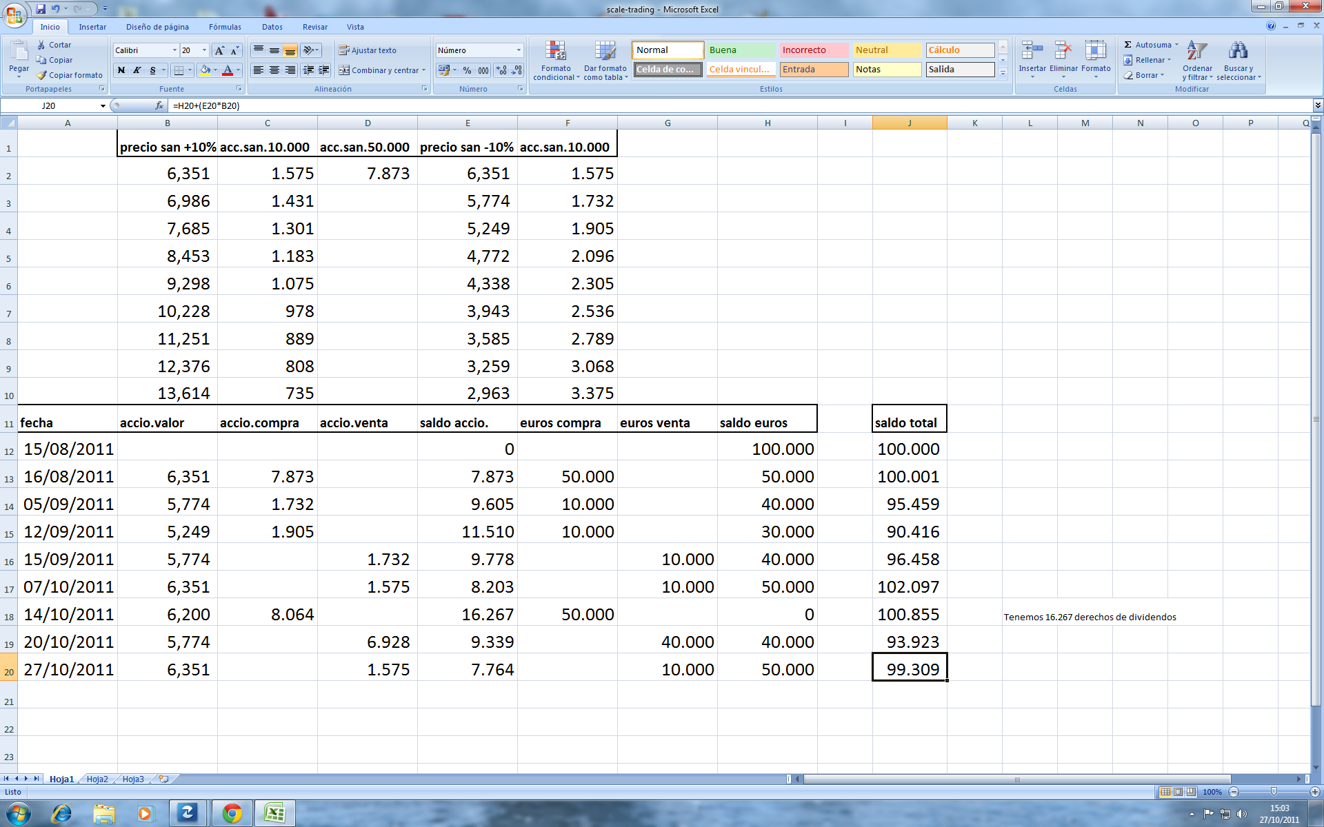 El san ha llegado a la cotizacion de 6,35, asi que ... fieles a nuestra estrategia, corremos a vender 10.000 euros en acciones... con lo que nuestra estrategia queda de esta manera...