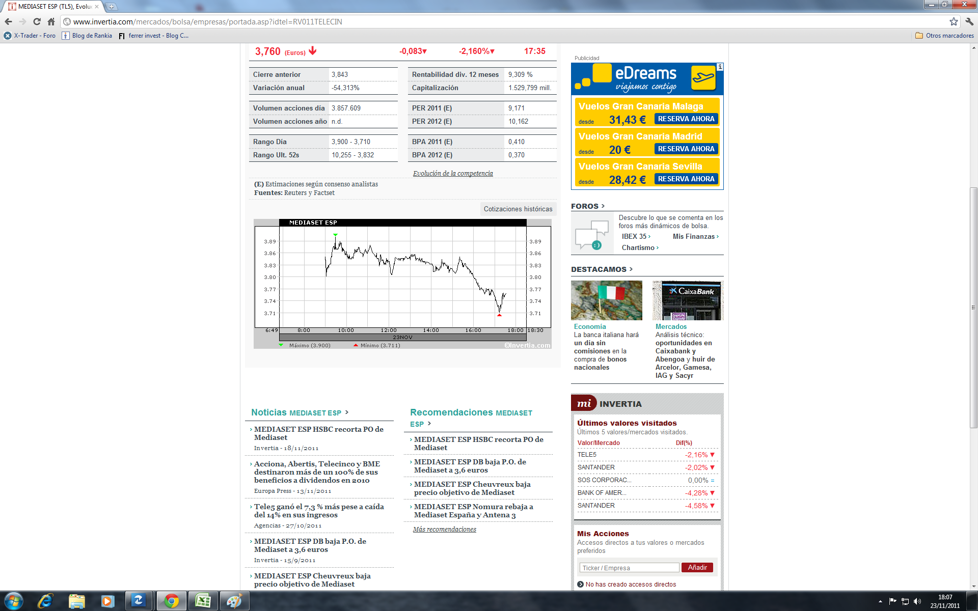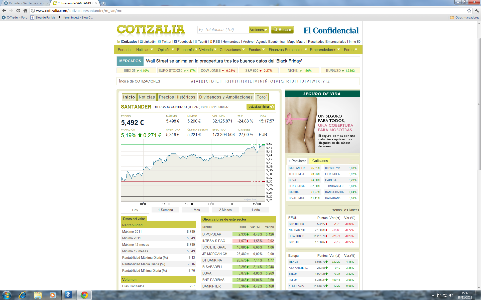 Bueno, veamos, hoy... que yo vea, todavia no han llegado a ninguno de los topes que yo he puesto bien para la estrategia del santander o bien para la estrategia del tl5. Asi que... hoyyy, no me han saltado ninguna de las alarmas que tengo puestas... ni ha llegado a 5,77 en el san, ni ha llegado a 4 en tl5, asi que... todo esta como estaba, es decir, normal.