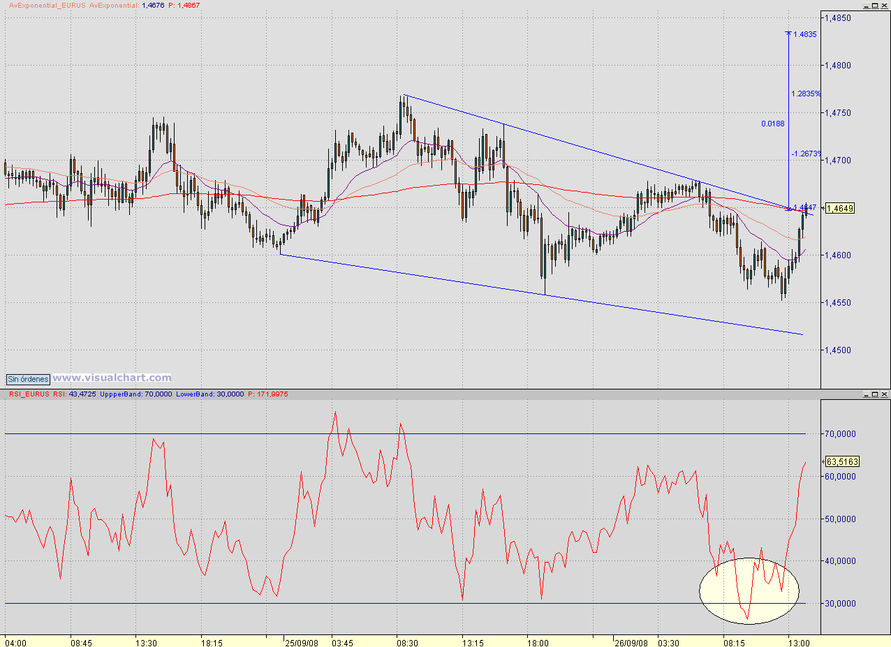 Holas. He estao en er pueblo. La verdad es que el otro día la cagué con el análisis de una forma mu tonta y me costó 50 pips de stop. La divergencia alcista que aparecía en el RSI 15" era más bien dudosilla porque el mínimo del primer pico (punto 2) no era absoluto u sea el mínimo anterior (punto 1) era más hondo y al final, claro, salió rana.