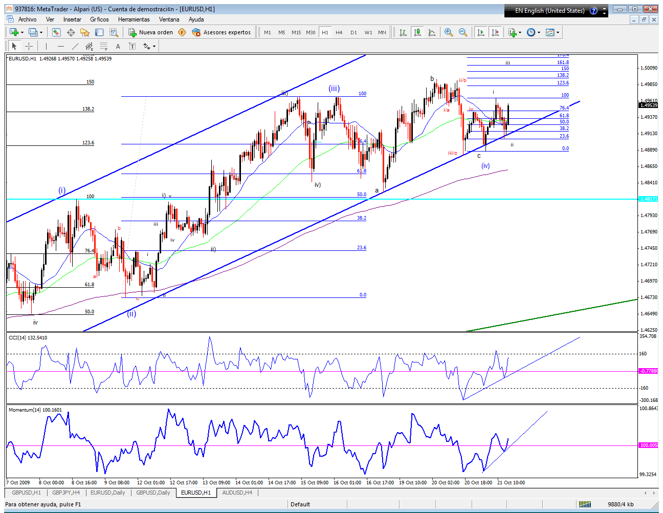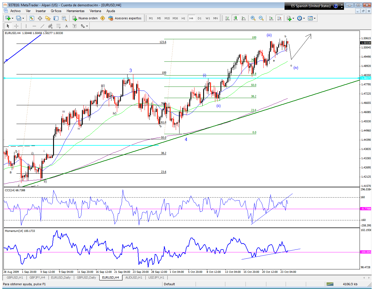 Bueno siguiendo con el conteo de una posible sub-onda (i) extendida de 5ta , todo parece indicar q en este momento el par acaba de terminar la onda minutte ii y se dirige hacia la zona del 1.5012 aproximadamente donde estaria la onda minutte iii , y en dicha zona deberia formarse una correccion lateral ( regla de la alternacia ) para posteriormente seguir en busca del 1.51-1.5150 aproximadamente donde deberia terminar dicho mov alcista ( esto es siempre y cuando la sub-onda (i) siga como una extendida y q la 5ta no pase del 1.5199 pues de ser asi entonces la sub-onda (iii) quedaria como la mas pequeña siendo esto una violacion de las Ondas de Elliott ).Suerte