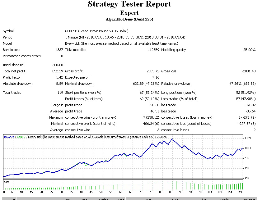 ledzep escribió: En 1M como es lògico es imposible subir del 25%. Hasta donde mi escaso conocimiento me alcanza en MT4 no es posible trabajar en ticks el TF mínimo es 1M. Cuando hacemos un backtesting en modelo "every tick" de ninguna manera significa que el MT4 emplee informaciòn a nivel de ticks, significa que usara el TF mas bajo disponible para modelar la dinàmica de la barra. La cuestiòn tiene su lògica... hacer una simulaciòn en ticks dado el enorme volumen de datos seria extremadamente lento.