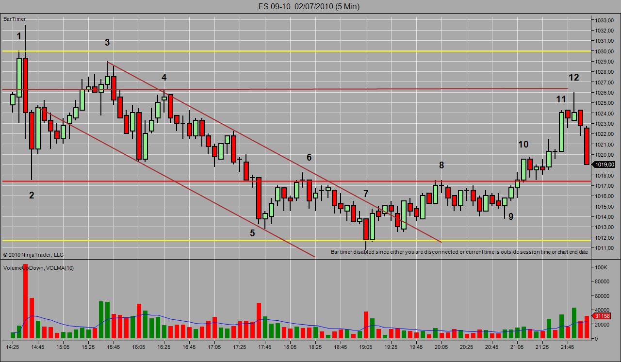 Los mercados son fractales,eso no es ningun misticismo,es la realidad,las mismas señales sirven en cualquier marco temporal. Lo unico es que algunas señales necesitan una mayor confirmacion si el timeframe es muy pequeño. Por ejemplo un pivot,en un grafico de dias nos lo formarian tres velas pero en uno de un minuto le pediriamos cinco velas para una mayor confirmacion. De todas maneras hay patrones validos en cualquier marco temporal,soportes,resistencias,lineas de tendencia,etc. Solo miro el grafico de 5 minutos,no me importan los demas,pongo un ejemplo del ultimo dia,todos podreis observar que estas señales no tienen nada de especial para graficos de 5 minutos. Yo hago scalp,objetivo siempre a un punto y nunca hago trading durante mas de dos horas. Lo que voy a decir no tienen porque ser mis trades ni mi operativa. Tampoco voy a decir en que momento se deberia haber entrado,tan solo comentar señales.