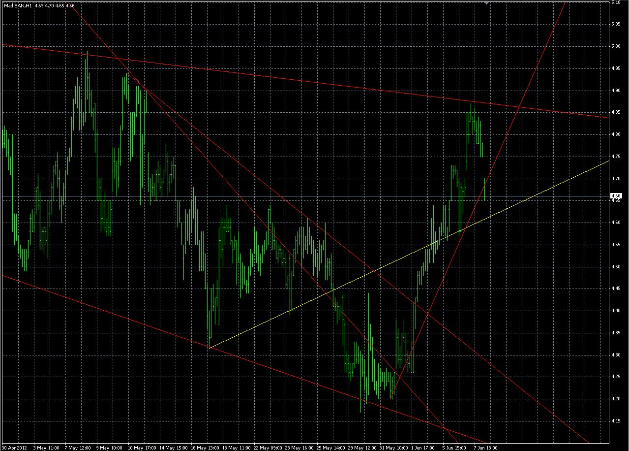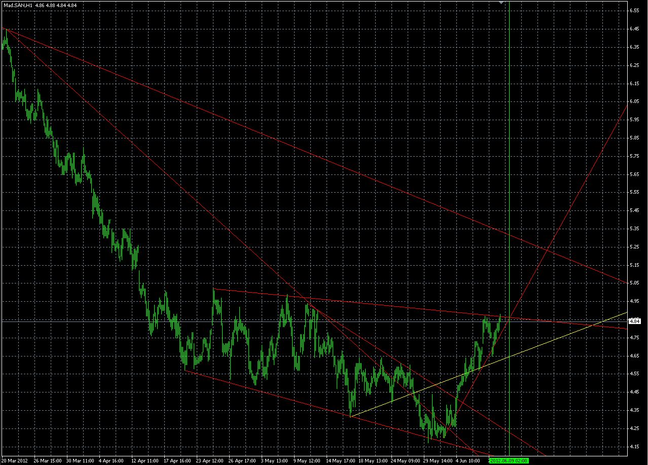 Viendo como esta el panorama con lo de los 100.000 millones, cabe esperar que el Gap sea alcista, pero sigo manteniendo que el san bajara a tocar la linea de soporte marcada en color amarillo. Ya me paso a las 09:00 para analizar el gap :P