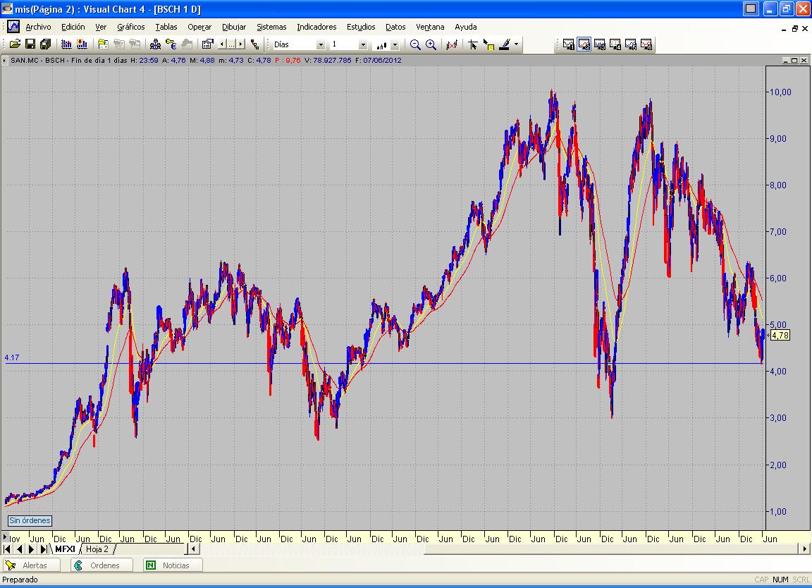 Santander sigue subiendo pero se acentúan las divergencias bajistas, y el macd esta apunto de cortar a la baja así como la formación de velas, otra vez más, no es esperanzadora, pero no hay que olvidarse que lo que manda es el precio y si quiere seguir subiendo pues que siga; subimos el stop a 4.65, nuevo soporte, el objetivo sigue siendo el mismo.