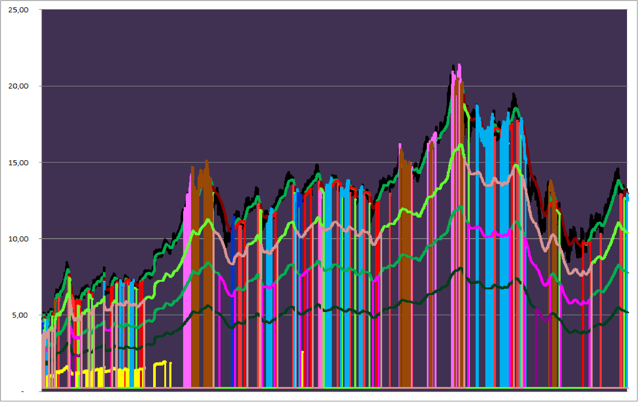En el grafico vemos muchos colores cada color indica una condición que se ha proclamado, que establece un posible escenario, luego el propio proceso de timing establece si esa condición se ejecuta. Pudiendo generarse escenarios superpuestos pero con diferentes modelos de timing. Tan dispares como mercado totalmente bajista (con varios modelos de timing) y disposición de posible vuelta de mercado a la confirmación del modelo de timing en fase de tendencia primaria (esta viene denominada por un sesgo de mercado alcista en el muy largo plazo). Por poner un ejemplo.