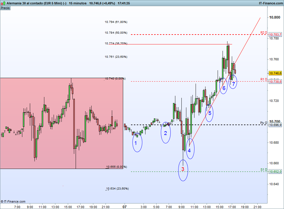 Entré vendido en la barra de las 9,00 horas, primera barra de volumen, los retail como yo al ver la barra bajista entramos cortos por gráfico de 5m con señal+un mal dato de producción industrial alemán, todo ello hizo posicionarme bajista en un mercado a corto y medio plazo aún alcista(cosas de novato), el cuidador del dax aprovecho la situación para darle la vuelta a la tortilla y rasparnos parte de la cartera.
