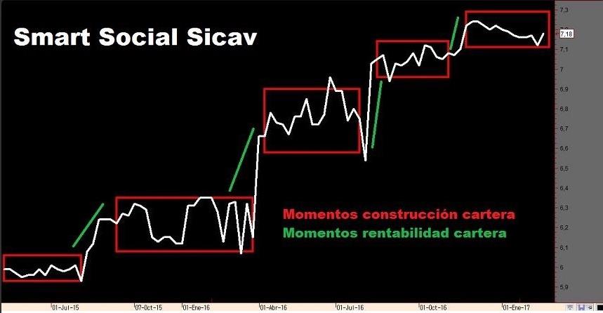 Por otro lado, el gráfico que pones, que es la evolución de la SICAV Smart Social, refleja más el promediado del que trata este hilo, que el proceso de pesado que comentas. Si ves el hilo "Carrera de Galgos", el último mensaje de X-Trader, te pone un zoom de la última de esas cajas de "formación de cartera", que no es más que un promediado puro y duro como los que trata este hilo, y que por cierto, está produciendo unas pérdidas latentes y un DD, tal y como sostiene parte la tesis de este hilo.