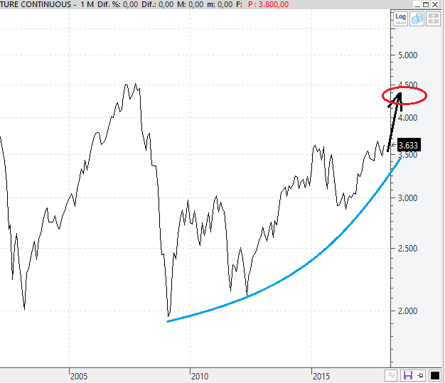 Mi sesgo es alcista si Europa no rompe al alza este año que parece que es el mejor año para Europa ¿cuándo será? si espera demasiado los datos macro así como las subidas americanas se esfumaran y no habrá dónde apoyarse. Una subida del 20-30% para caer un 20% posterior sería lo idóneo.