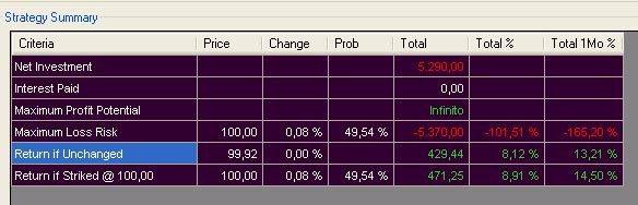 Resumiendo, para mi, esta estrategia es aplicable si el subyacende no se va a mover durante un tiempo cercano y luego va a moverse bastante, pero quién me dice que no va a ser al revés, primero moverse bastante para luego volver al 100 (caso peor). Puede que esté diciendo obviedades, pero creo que se entiende mejor así que con las delta, gamma, etc.