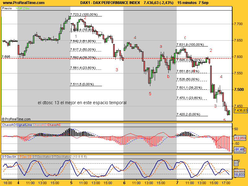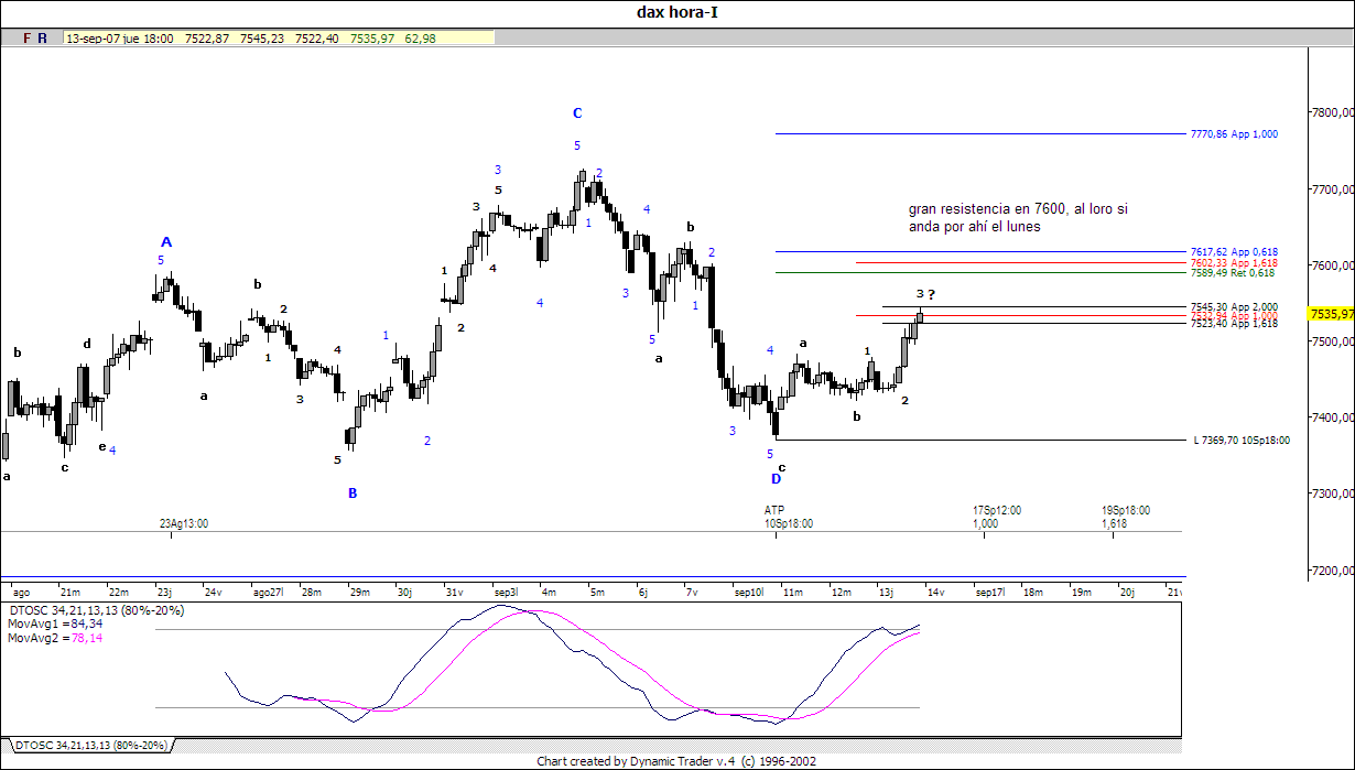 Pues podría ser una serie 1-2,1-2; pero la igualdad milimétrica entre los 2 movimientos (tb pasa esto en el mercao americano) me hacen pensar en un abc, o sea que la cosa se complica. El lunes rebotará. Si se está corto, habrá que ajustar los stops. Yo cerré a última hora el sp que me dio mal rollo. No creo que esté bajando ahora de forma impulsiva. Puede que esté en la onda 2 todavía. Por ahora, mientras no rompa el mínimo del viernes, no me pongo corto. El oscilador 8-5 en el diario apunta hacia abajo, pero está en sobreventa, el de 34 en 60m y observad el de 15. Para arriba vamos, lo malo es que no tengo ni idea de hasta dónde con la información de ahora. Ya veremos, pero dejar abiertos largos por la noche, como que da mal rollo.