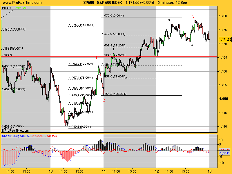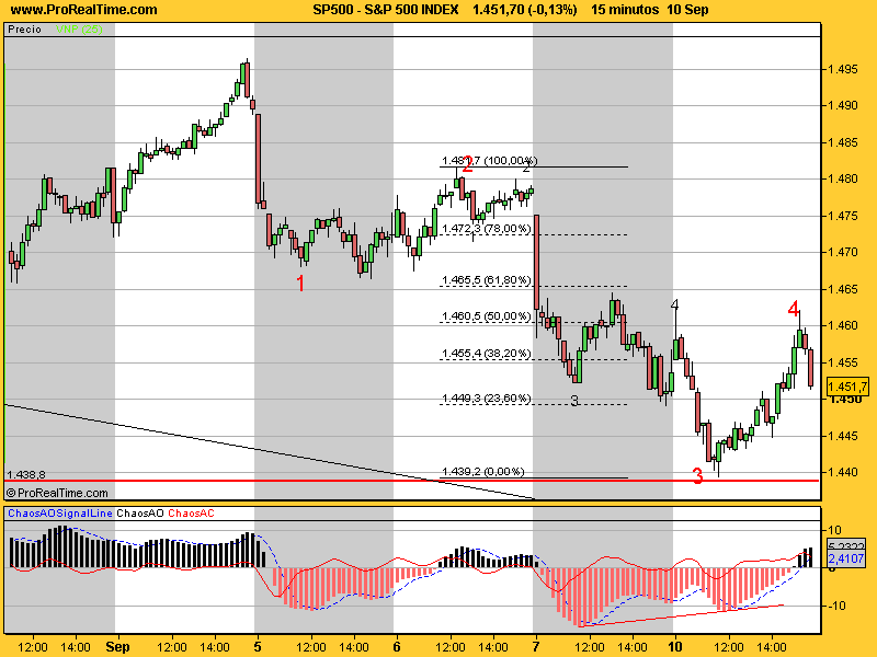 Pues el mínimo de ayer del dax sirve de referencia para mantener por el momento. Como que esto sube,vamos. Hoy pongo mi recuento del SP que si es correcto puede dar juego todavía: mañana la onda 4 oscilando pasito palante pasito patrás...y si el recuento está bien, la 5 se podría extender y llegar por los 1500. La extensión típica marca el 1499. Ya veremos, pero el final del impulso parece que pueda coincidir con el día 18