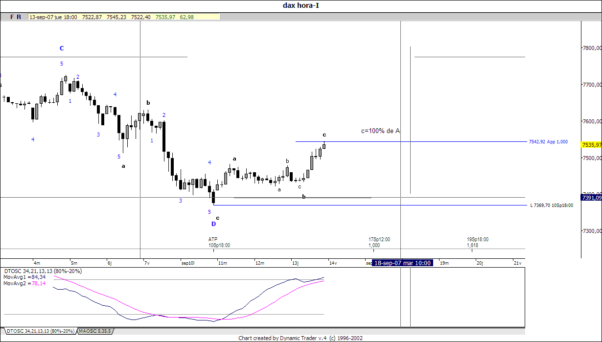 Pues he metío las proyecciones temporales en el gráfico de 5 min del dax y el 260 % de la última subida me sale a las 15 horas de hoy. Si sigue corrigiendo más tiempo, la cosa empezará a plantear serias dudas. Ahora bien, ta claro que desde el máximo de ayer no está haciendo un abc, sino una corrección compleja coñazo desas que duran más que el conejito de los duracels.