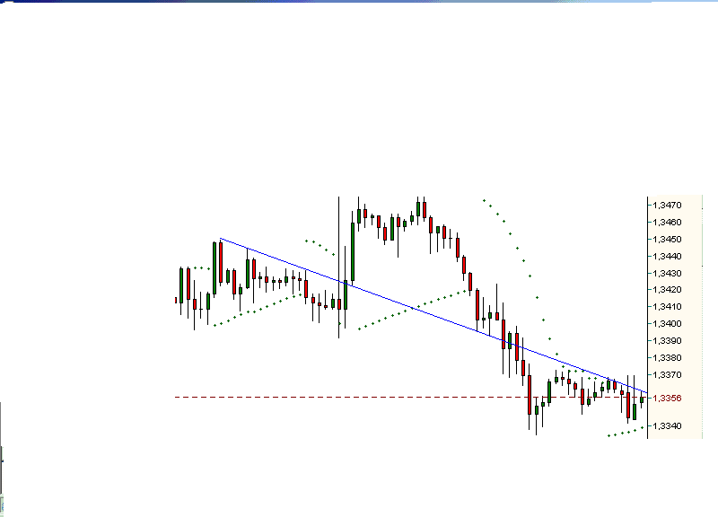 Por arriba ahora le cuesta superar la ahora resistencia 1,3370 (antes fué soporte), ademas hay una tangente bajista ke pasa por ahí +/- , si cruzamos una linea desde los 1,3450 (max. del día 10) hacia abajo.