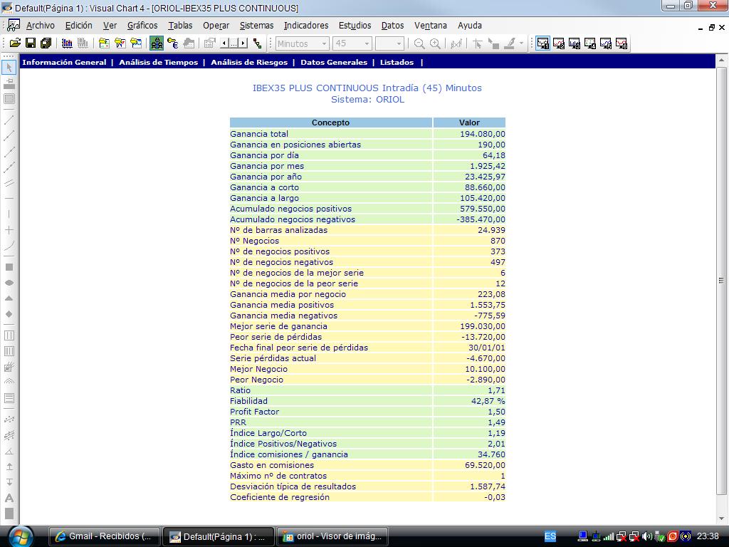 Acabo de terminar las pruebas de un sistema para el mini-IBEX, con bastantes buenos resultados. Lo malo es que acabo de romper mi vínculo con Visual Chart y tengo que migrar a Ninja Trader: Ahora SÍ tengo herramientas poderosas de optimización, con simulacion de operativa REAL en las optimizaciones, que no considera las posiciones válidas con sólo tocarlas, por ejemplo, y tiene optimización "walk forward" automática... INCREÍBLE. Ya estoy haciendo las primeras pruebas de un sistema sobre el S&P PODEIS VERLAS EN TIEMPO REAL AQUÍ.