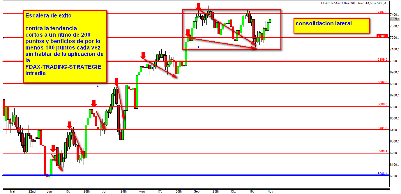 Por regla general es mejor operar con largos continuos con el FDAX debajo 5000 y cortos continuos encima 7400.