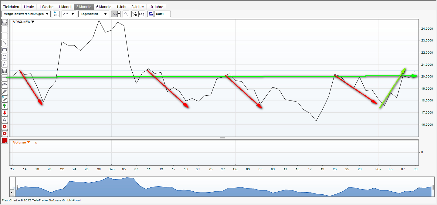 En cuanto el VDA-NEW cotiza por debajo de 20, se puede considerar abrir una posición larga en el área de cierre/apertura siempre que los DJIA FUT tengan tendencia en alza durante la noche y al abrir el FDAX a las 8h. La Z1 larga será entonces la segunda zona, Z2L.