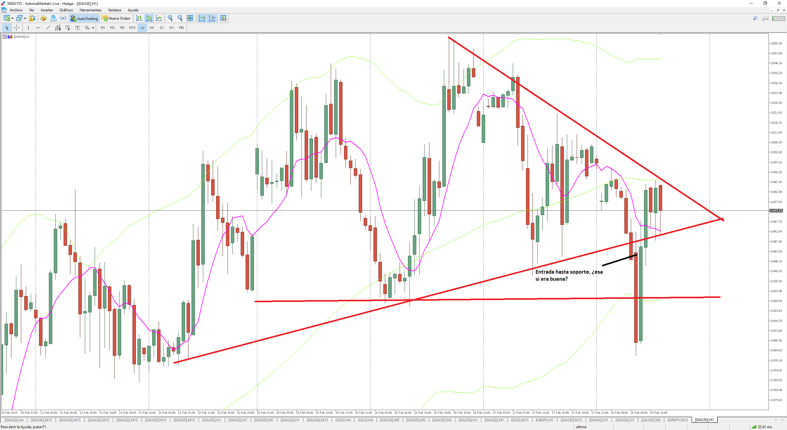 Ese rango esta en zona de resistencia con varios intentos fallidos y esta mañana bajan a buscar apoyo a niveles mas bajos, lo hacen rompiendo el nivel del pivote del ultimo retroceso y el rango de bollinger
