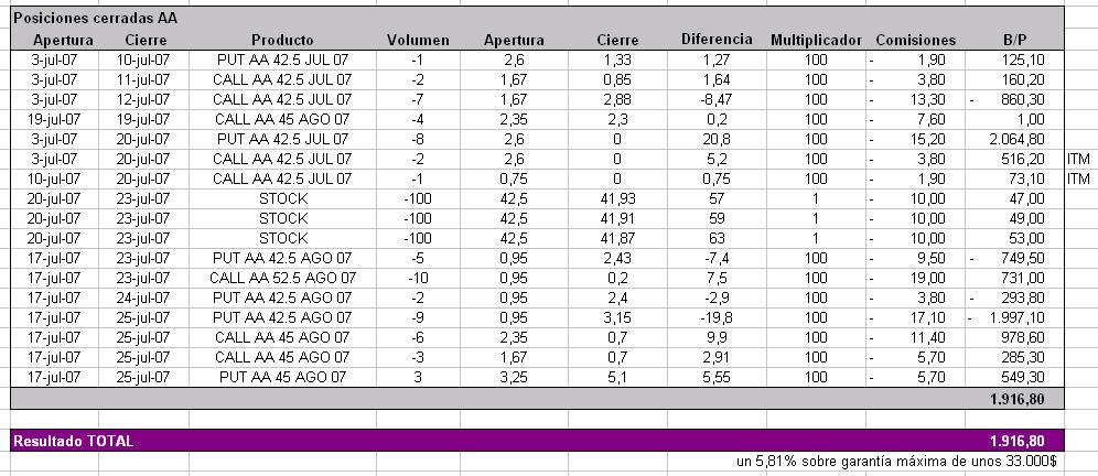 En lo de alcoa hoy recompramos 2 PUT AA 42.5 AGO 07 acabando el día prácticamente planos.