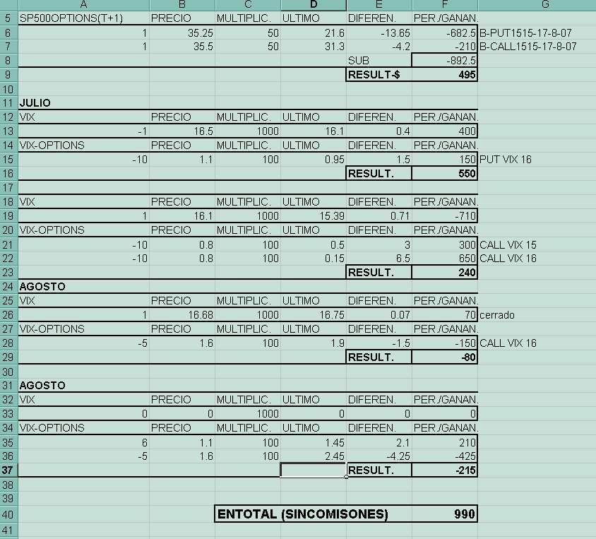 En Fin el punto de maxima ganancia y como dije de salida para no tener mas riesgos, lo toco el dia de Santiago, por la tarde, como no estaba delante de pantalla supongo los datos de cierre, con los que nos queda un beneficio de 990$ sobre unas garantias supuesta y tirando "parriba" de 2000$, en el caso de la estrategia total. Si hubieramos abierto a el calendar y el put-ratio del vix y nos hubieramos olvidado, la cosa hubiera quedato en unas ganancias de 300$ sobre una garantias de menos de 1000$, lo cual tan poco parece que este mal, los por cientos (%) lo dejos para el que los quiera poner, no se cuanto llevamos deestrategia ya parece como de casa......?:lol: