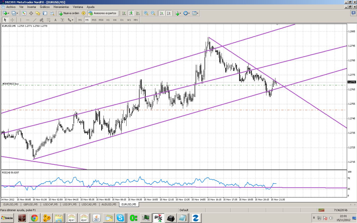 Tengo el canal alcista este a 5 minutos, que había perdido el soporte, por eso el cortito, esperando que en la sesión asiática me diera algunos pips.