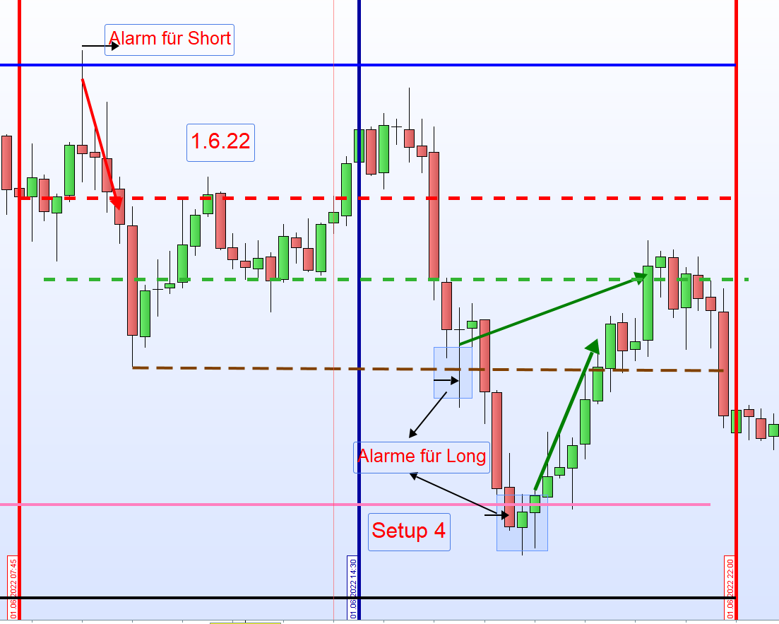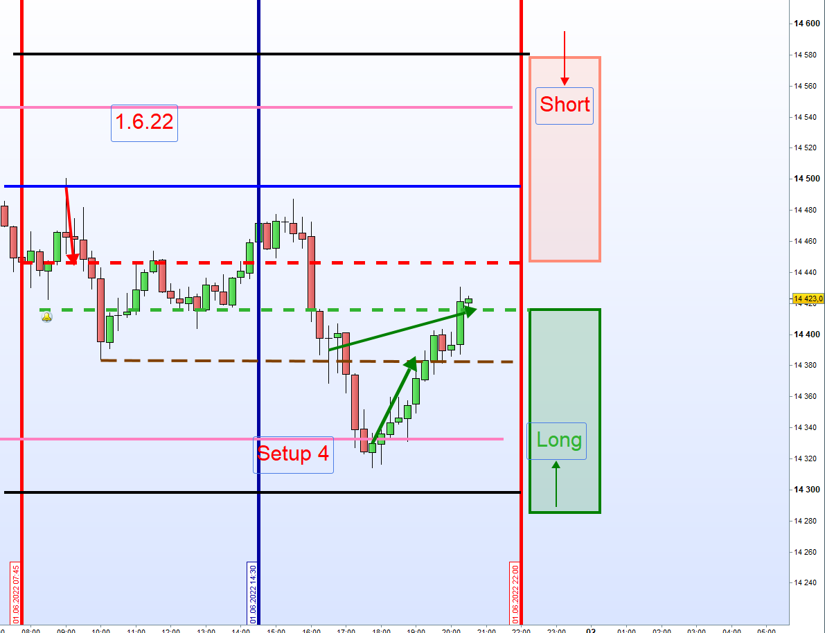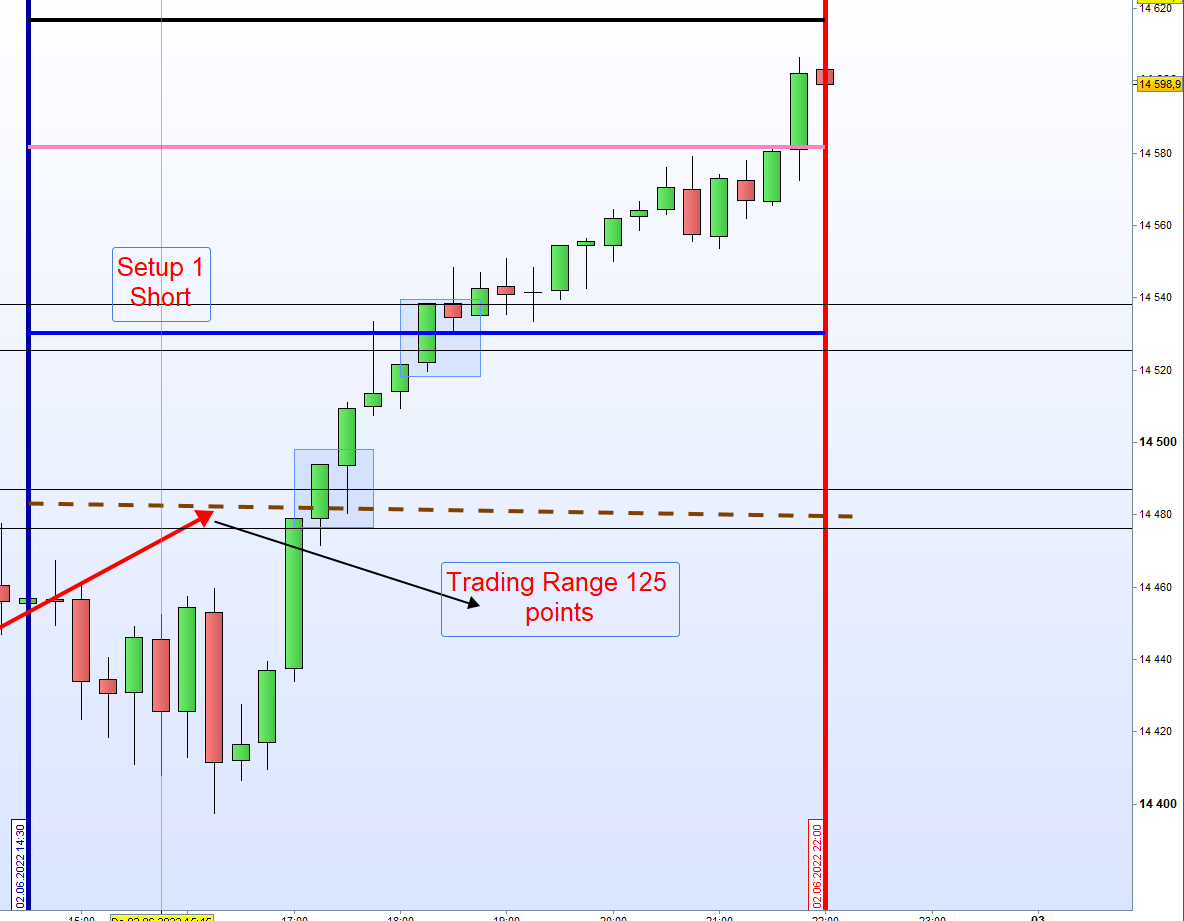En la sesión de tarde, una vez el precio pasó los máximos de la mañana y siendo superiores a los 125 puntos que ajustamos para un VDAX-new inferior a 25, estamos atentos por si se cumplen las condiciones del Setup 1, lamentablemente al llegar a las zonas, no se produjo la vela de reversión que sirve de gatillo de entrada, como bien muestra la imagen que envío Georg.