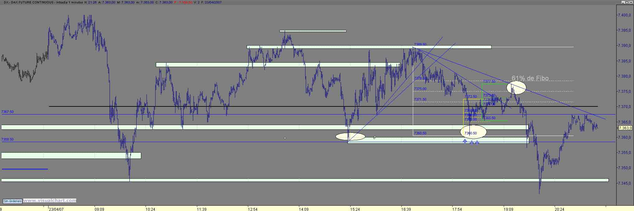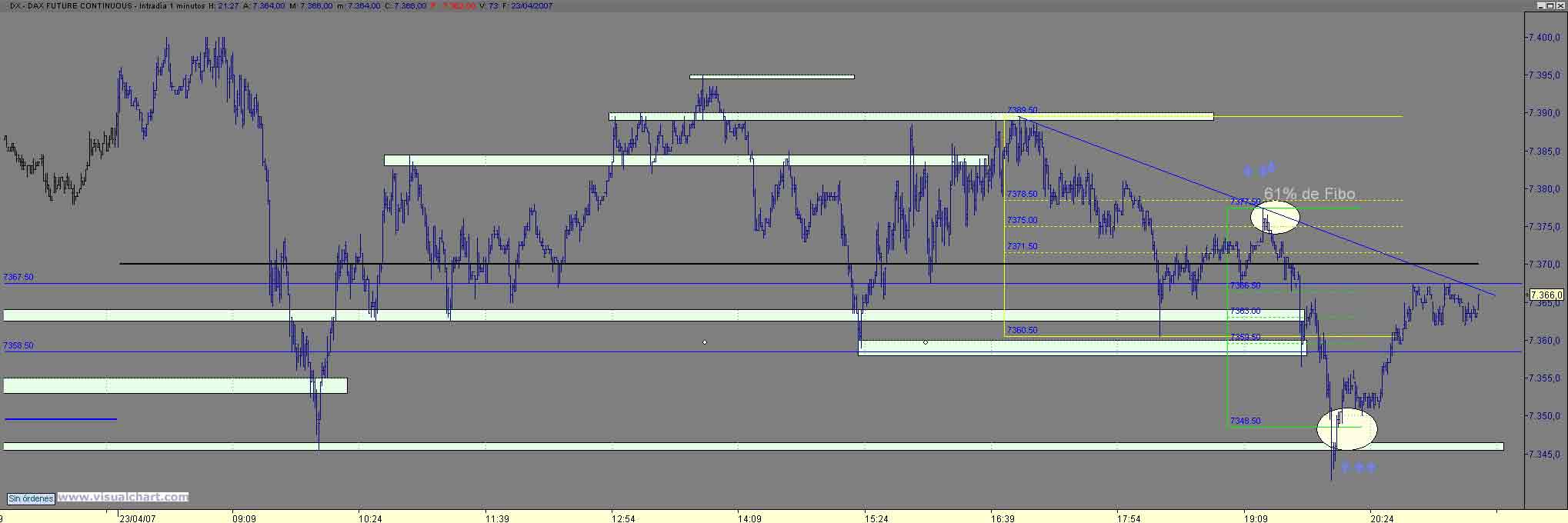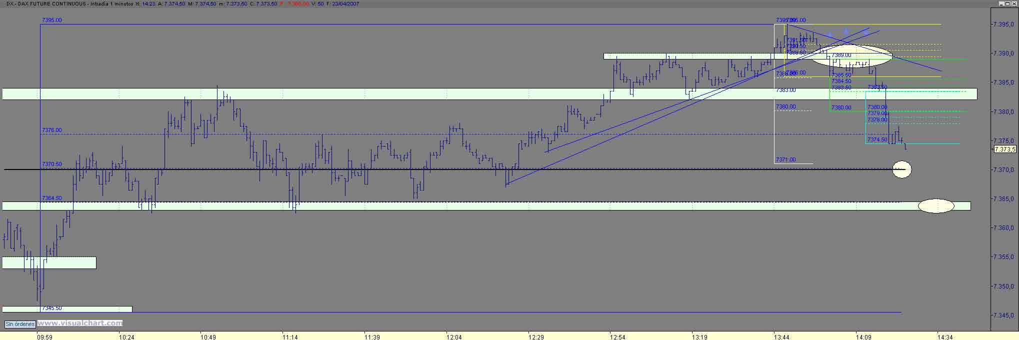 Nuestro querido Dax no nos da tregua y tras alcanzar el obj señalado en 91 (anda que el que no se haya subido no sera porque no le ha dado oportunidades) y tras romper esa direztriz que llevaba desed el lateral del 64 75 y tras perder el nivel del 89 ultimo maximo antes de ese obj de 91 desarrolla tres estrcturas a la baja apoya en la diverg en 5m con onj 80(1) 74.50 (2) posible extension al nivel del 7371 zona de pivot y 50% de Fibo de la subida desde el nivel del 7345.50 Un Saludo