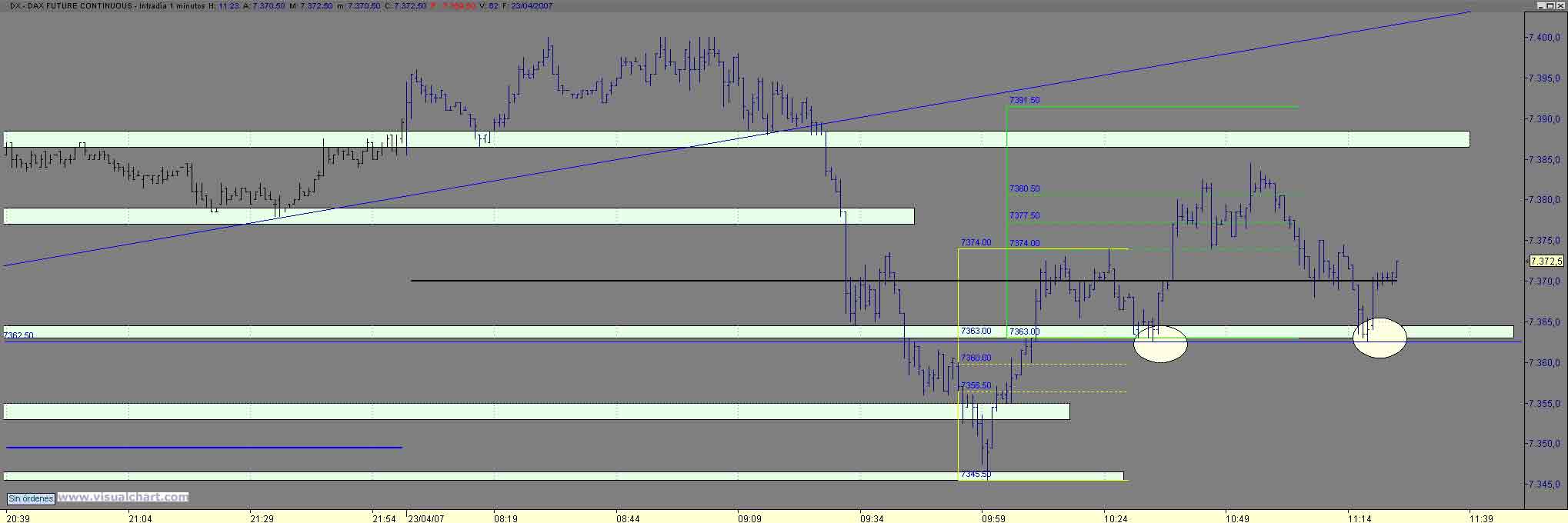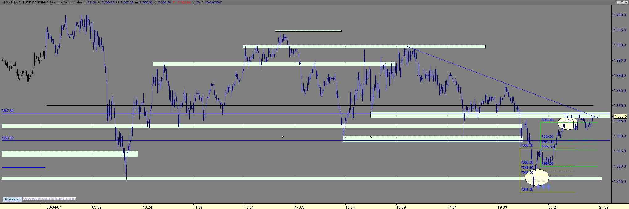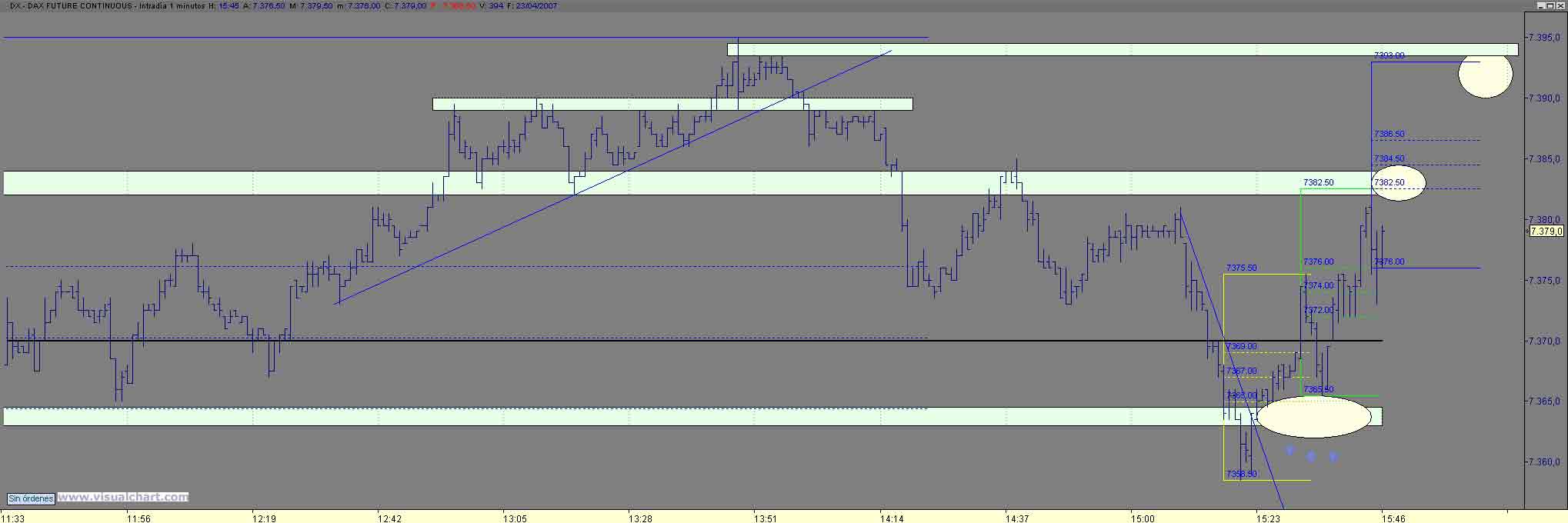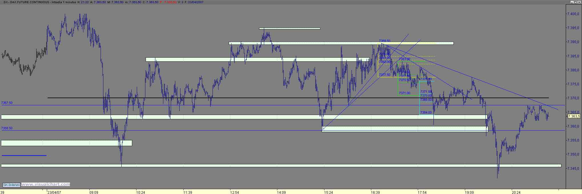 Nuestro querido Dax no nos da tregua y tras alcanzar el obj señalado en 91 (anda que el que no se haya subido no sera porque no le ha dado oportunidades) y tras romper esa direztriz que llevaba desed el lateral del 64 75 y tras perder el nivel del 89 ultimo maximo antes de ese obj de 91 desarrolla tres estrcturas a la baja apoya en la diverg en 5m con onj 80(1) 74.50 (2) posible extension al nivel del 7371 zona de pivot y 50% de Fibo de la subida desde el nivel del 7345.50 Un Saludo