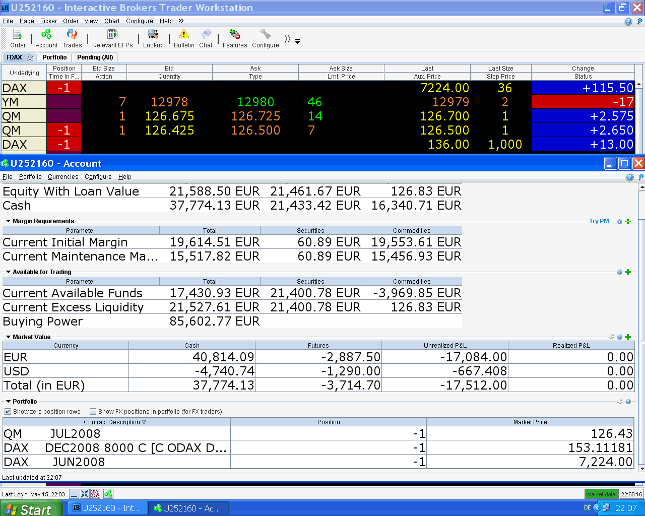 en el contrato del petróleo cambié el vencimiento de junio por el de julio, esta vez solo pierdo 0,20 $. Y además, es la primera vez que lo hago, he vendido una Opcion del DAX, 1 CALL 8000 Diciembre 2008 a 122 EUR, los 600 EUR que he recibido ya los retiré de la cuenta, son para gastármelos en cubalibres en las fiestas del verano que ya empiezan este mes.