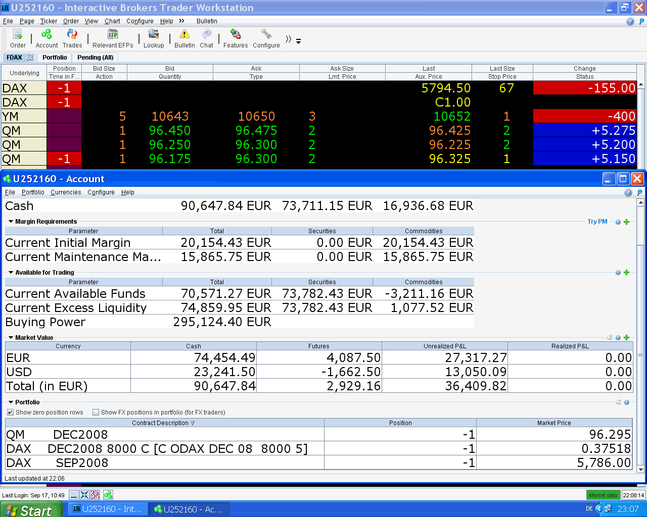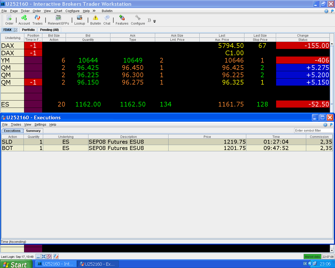 Ayer, antes de acostarme vi que se movía mucho el Futuro del Mini S&P y decidí ponerme corto en 1219,75, lo hice más bien para pasar el tiempo, dejé una orden de compra en 1201,75 y me fuí a dormir. Ahora me acabo de levantar y veo que se ejecutó, cuando uno está en racha le sale todo ...