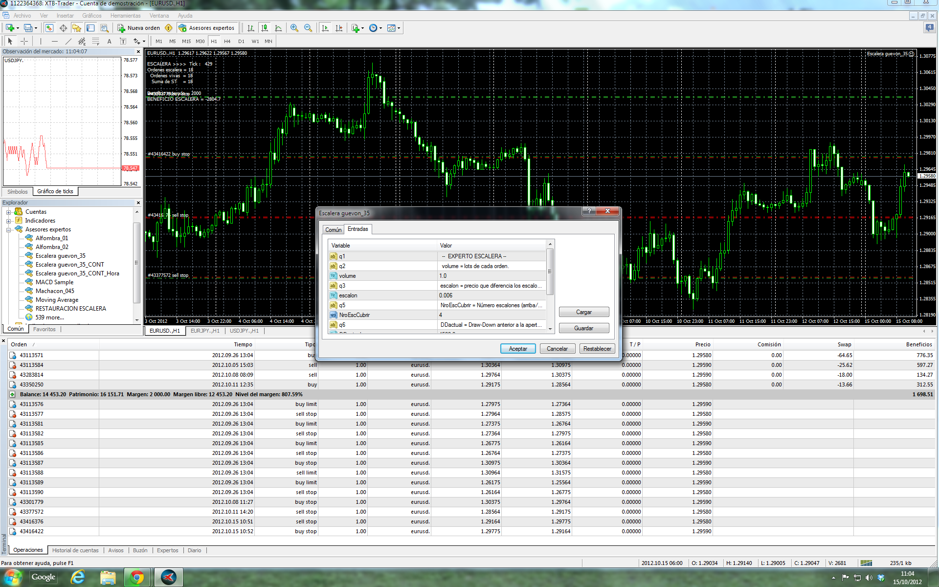 Vamos al grano, sobre la pantalla tenemos el cuadrito que nos sale cuando ponemos el experto en marcha, y lo primero que nos pide es de cuantos lotes queremos que sean las compras y ventas de nuestra escalera... este campo lo rellenaremos segun sea nuestra capitalizacion de nuestra cuenta, puesto que tenemos que tener en cuenta no hacerlo demasiado grande que con dos escalones nos deje sin margen ni demasiado pequeño que solo ganemos centimos con una cuenta de millones de euros...